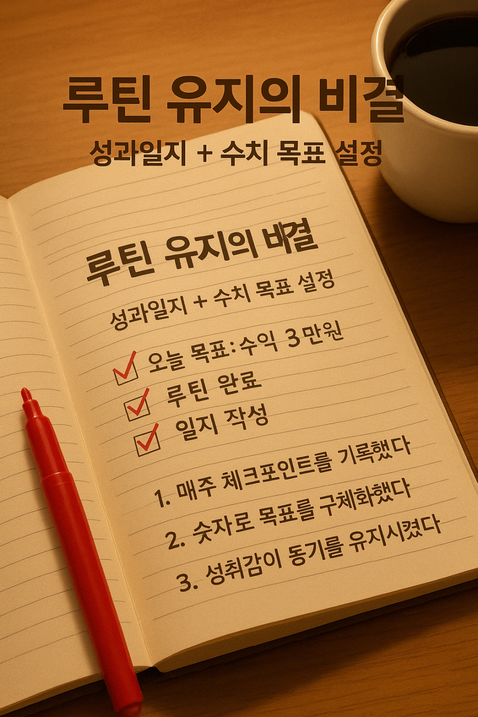 지속 가능한 루틴을 유지하기 위한 팁도 있습니다. 매주 ‘성과일지’를 작성하며 체크포인트를 기록합니다. 그리고 목표를 수치화(예: 이번 주 수익 목표 3만 원)하여 실천력을 유지했죠. 작은 성취가 동기부여가 되더군요.