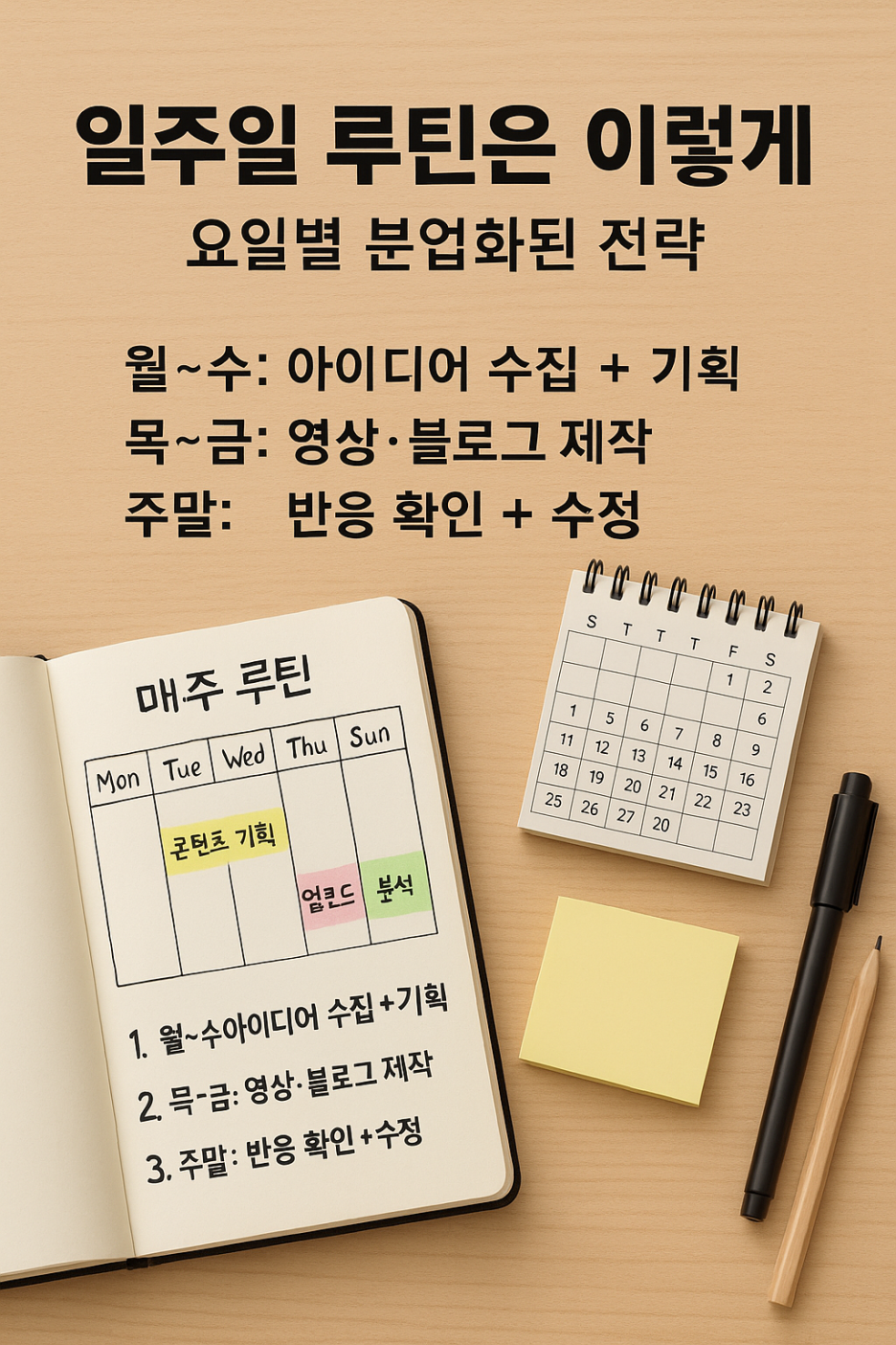 부업 루틴은 다음과 같습니다. ① 월수: 콘텐츠 아이디어 메모 및 기획. ② 목금: 콘텐츠 제작 및 예약 게시. ③ 토~일: 반응 분석 및 키워드 수정. 이렇게 일주일 단위로 반복하며 ‘패턴’을 만들었습니다.