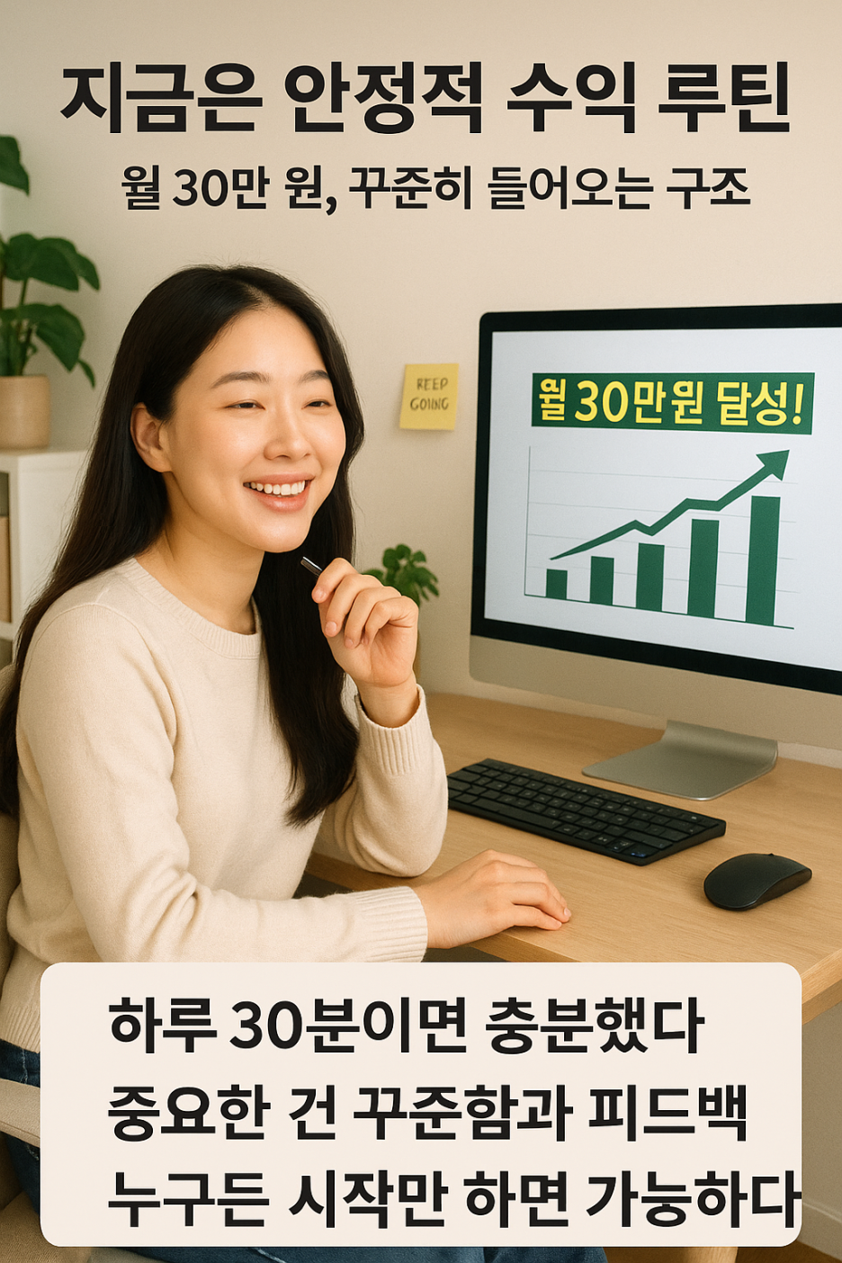 이 모든 과정을 거쳐 지금은 월 30만 원 수익이 꾸준히 들어옵니다. 물론 누구나 쉽게 되는 건 아닙니다. 하지만 하루 30분, 꾸준함, 피드백만 있다면 충분히 도전해볼 수 있습니다. 지금 시작해보세요.