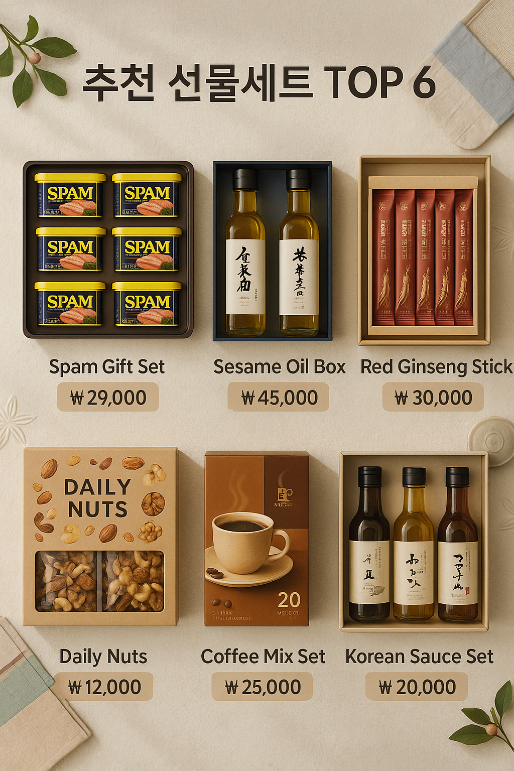 | 6 | 전통 장류 세트 (된장+간장) | 약 25,000원 | 전통+실용성, 어르신 만족도 높음 |
