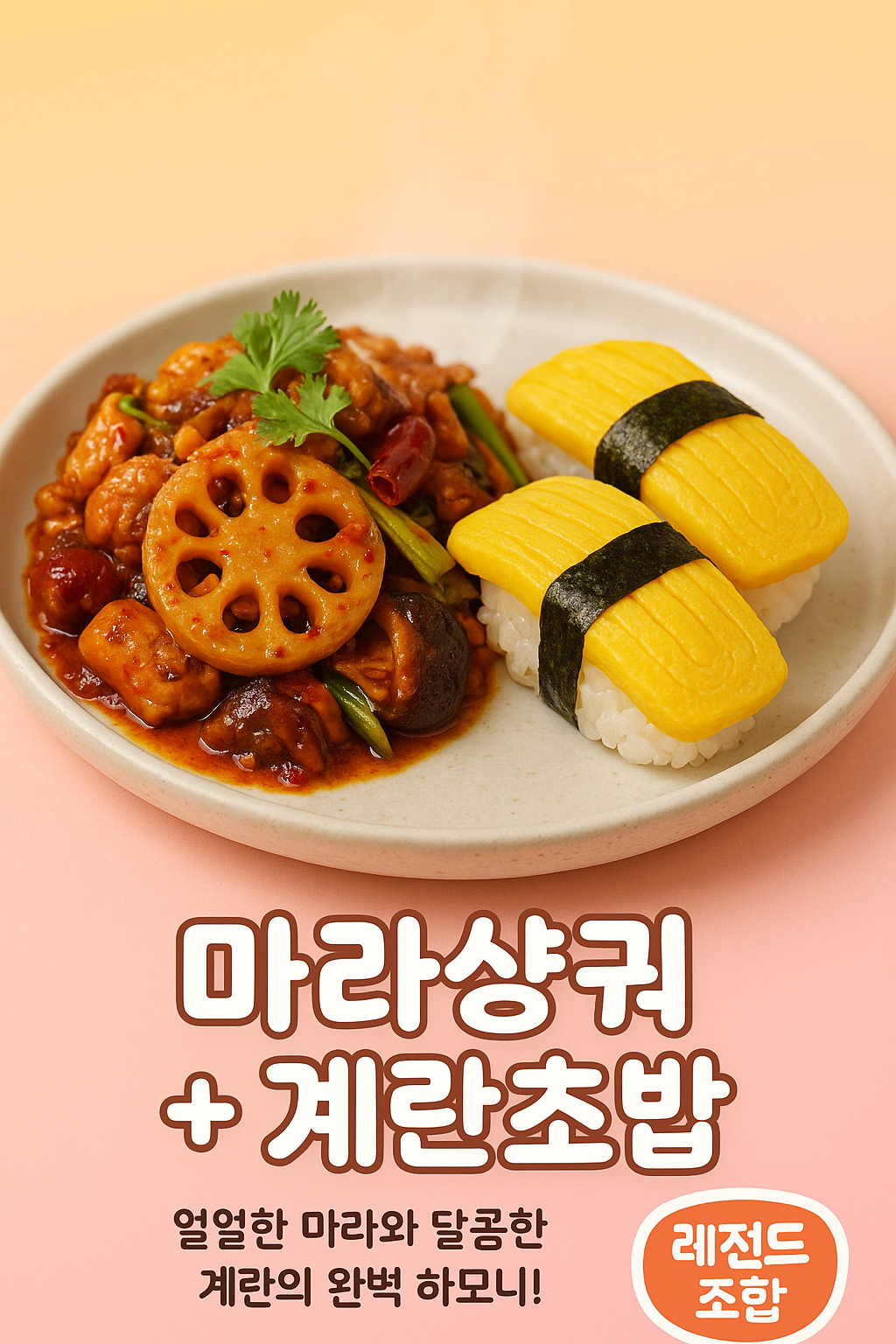 Image ALT: Mala xiangguo paired with tamago sushi to soften the heat (Korean viral food 2025).