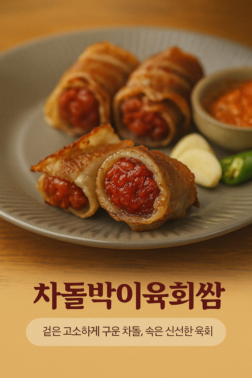 Image ALT: Chadol brisket topped with chilled yukhoe, wrapped in ssam leaves (Korean viral food 2025).